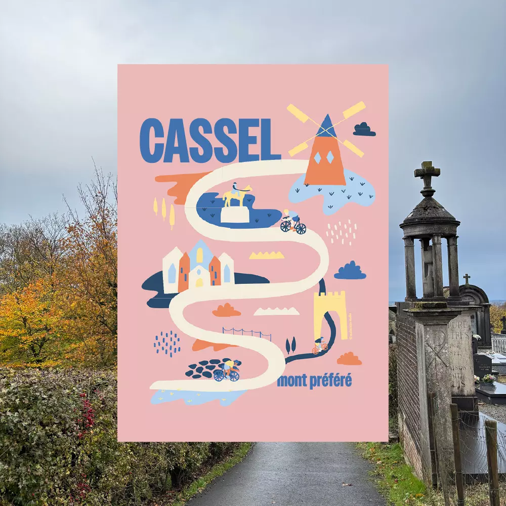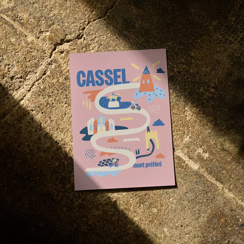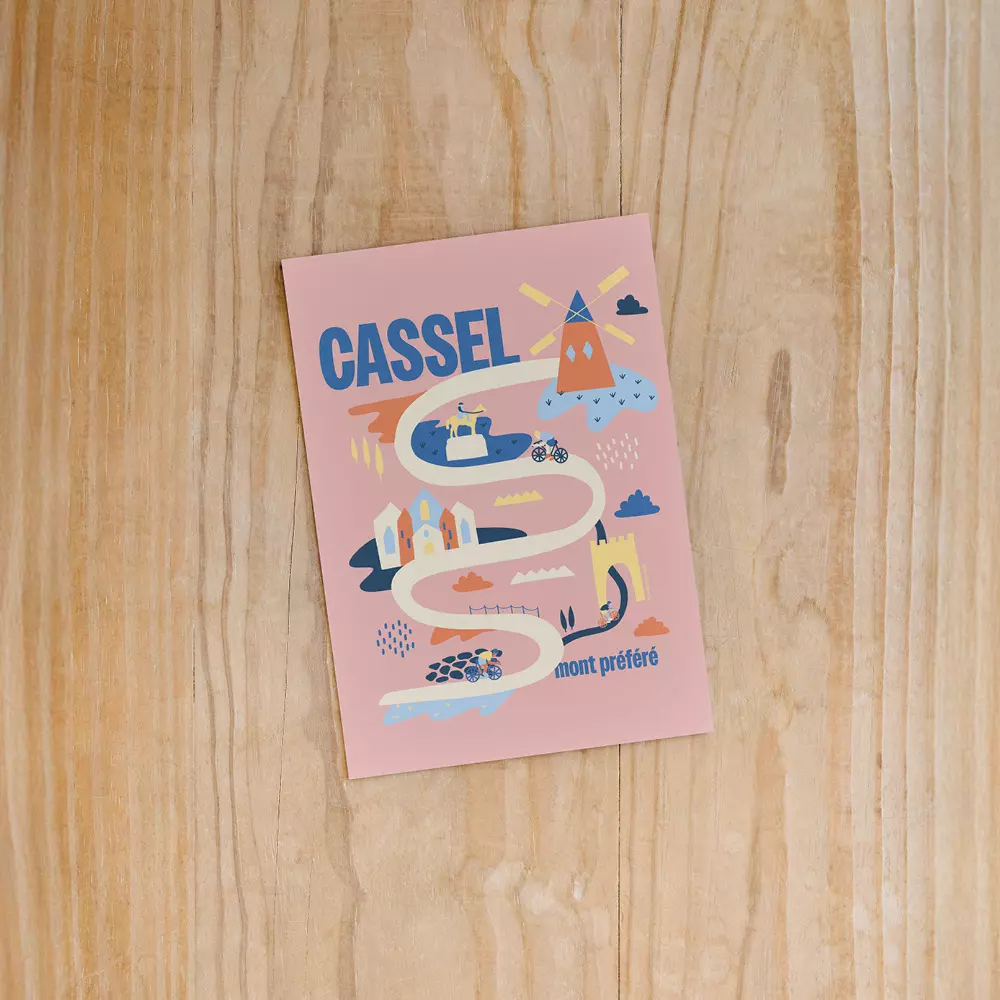 Carte postale rose. Le mont Cassel fait partie des trois monts préférés des cyclistes. Première et quatrième étapes du Tour de France, le mont Cassel représente un défi pour tous ceux qui aiment se challenger.