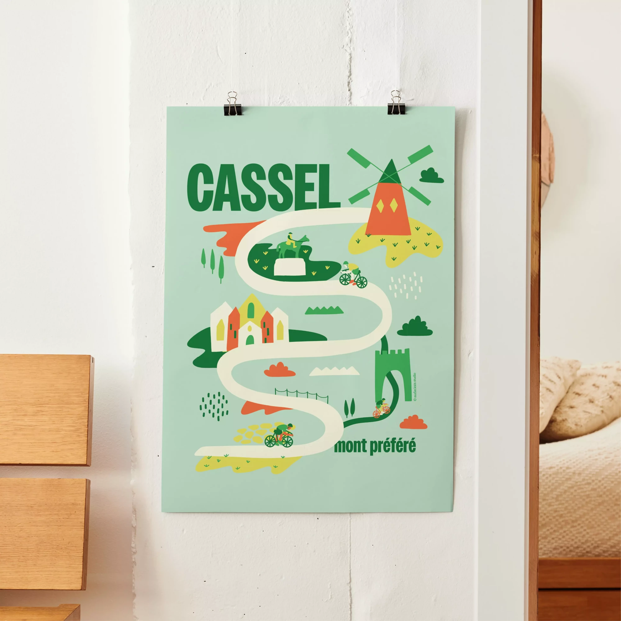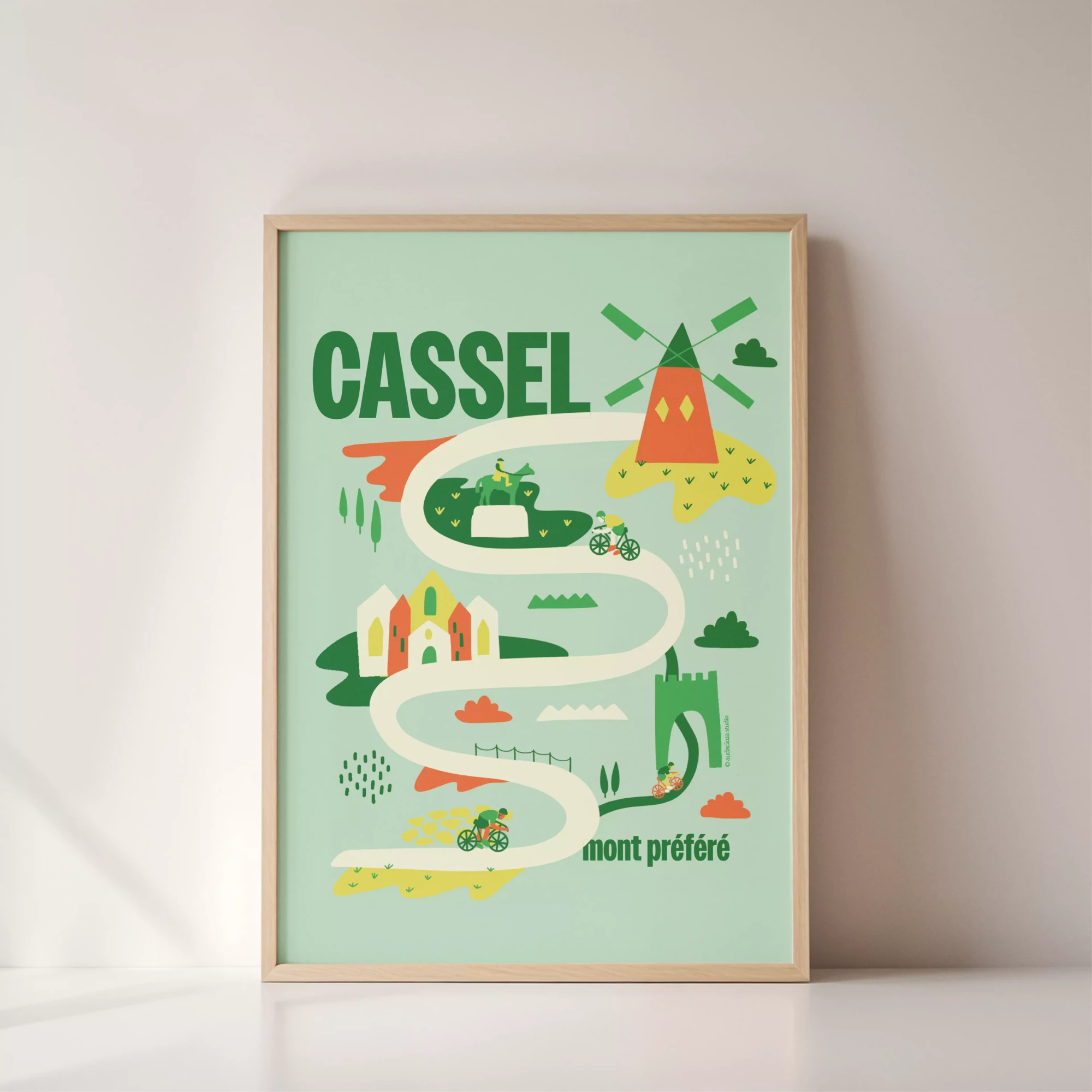 Affiche vert. Le mont Cassel fait partie des trois monts préférés des cyclistes. Première et quatrième étapes du Tour de France, le mont Cassel représente un défi pour tous ceux qui aiment se challenger.