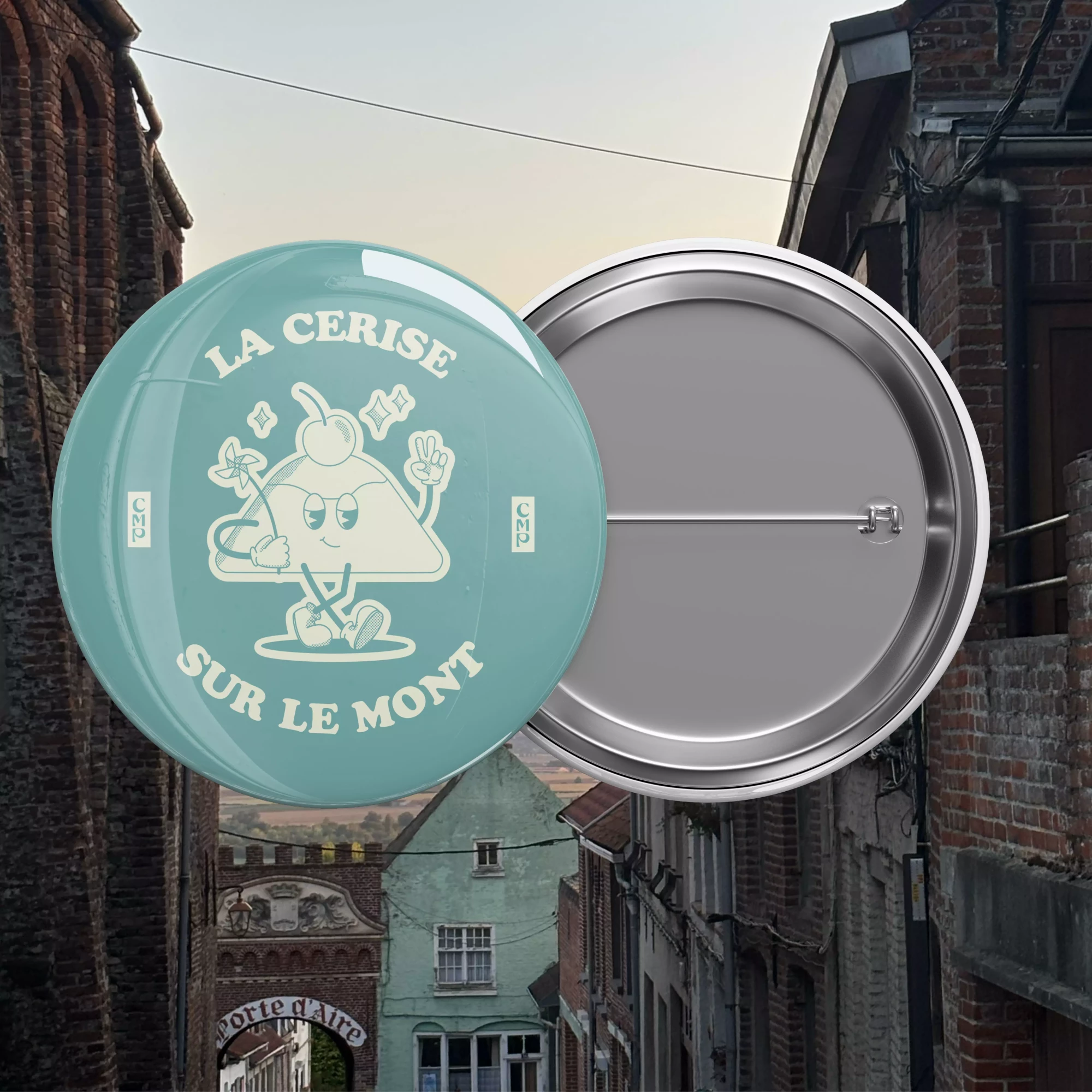 Badge illustré du mont Cassel, « La cerise sur le mont ».