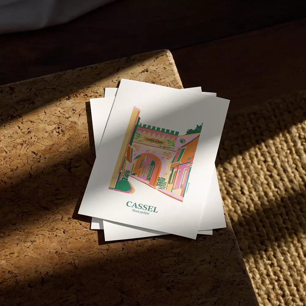 Carte postale de la porte d’Aire. Située sur le flanc sud du Mont Cassel, c’est une des quatre portes de l’enceinte médiévale qui existe encore dans la ville.