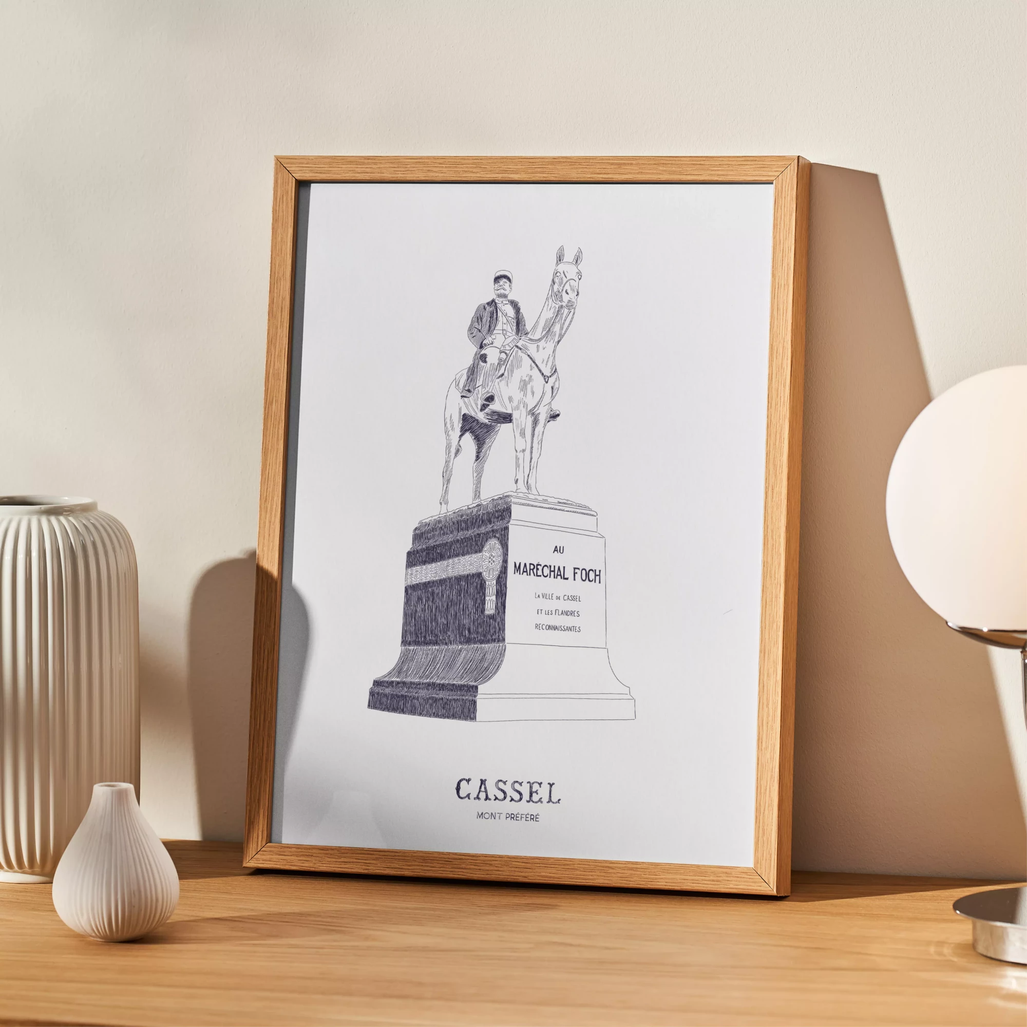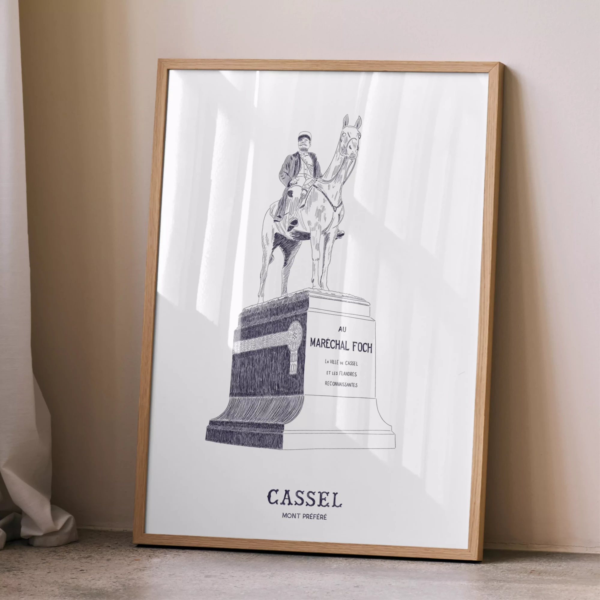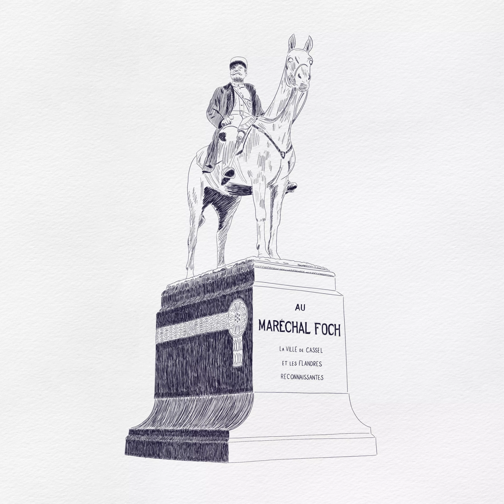 Affiche de la statue équestre du Maréchal Foch, située au sommet du mont Cassel. Inaugurée en 1928, en présence du Maréchal Foch, la statue rend hommage à l’homme qui dirigea les batailles de l’Yser et d’Ypres lors de la première Guerre Mondiale.