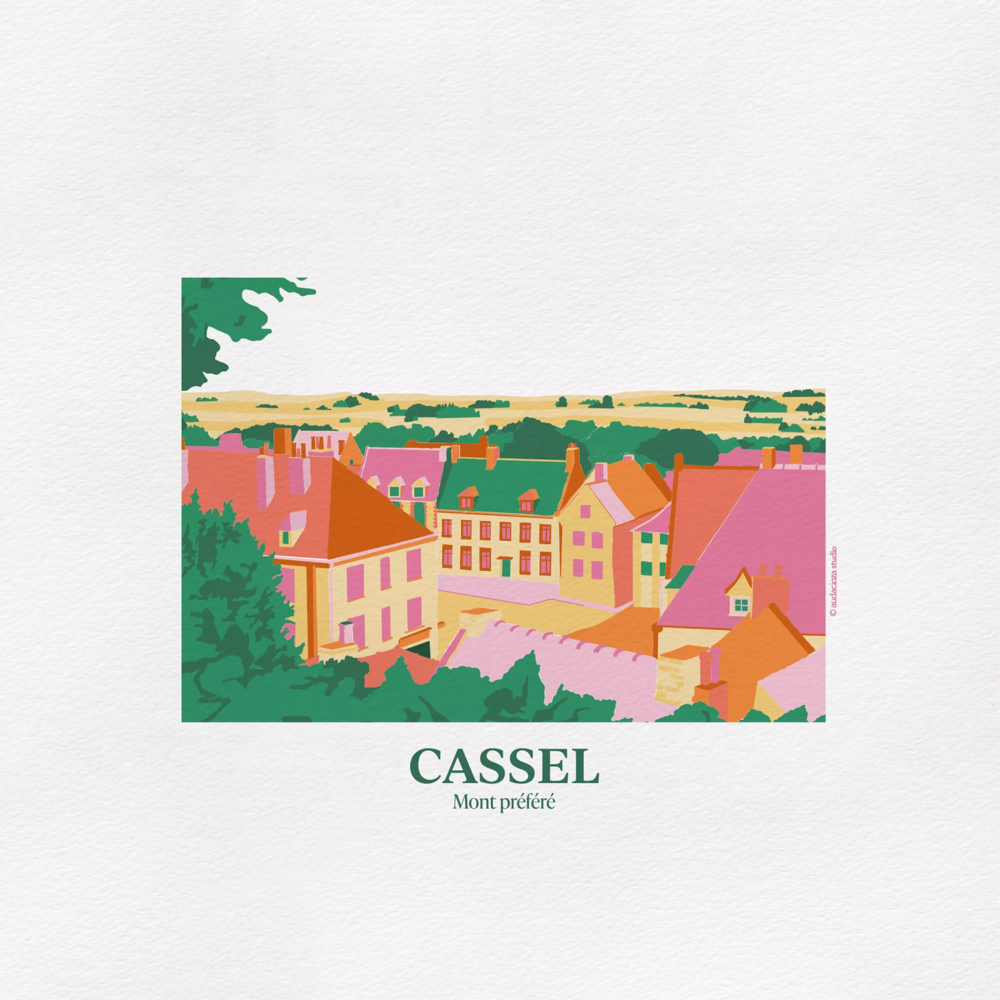 Carte postale de la vue du Mont Cassel, le plus haut village de Flandre avec ses 176m d’altitude. Élu « Village Préféré des Français » en 2018, Cassel est un village authentique et attachant.