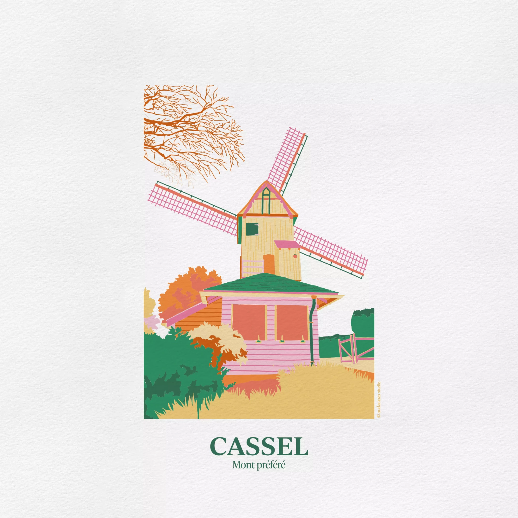 Carte postale du moulin de la terrasse du château, le Casteelmeulen, situé au sommet du mont Cassel. Bâti en 1629, il fut détruit par un incendie et ne fut jamais reconstruit. 37 ans plus tard, le Brande Staeckmeulen d’Arnèke fut acheté et reconstruit sur la terrasse du château, au point culminant des Monts des Flandres.