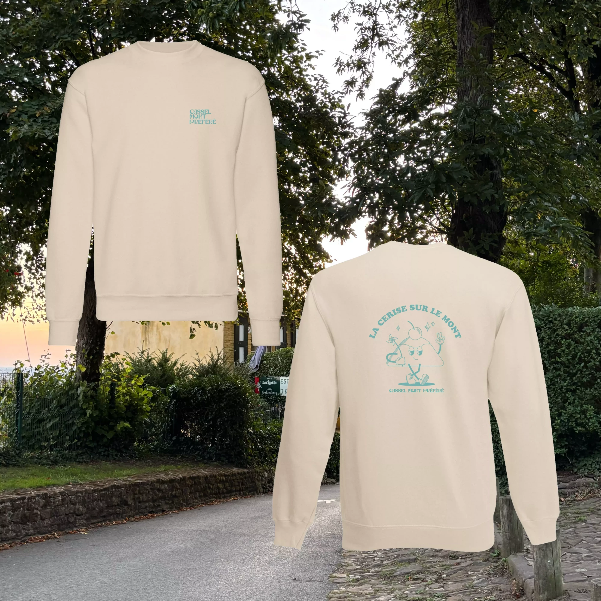 Pull beige illustré du mont Cassel : « La cerise sur le mont ».