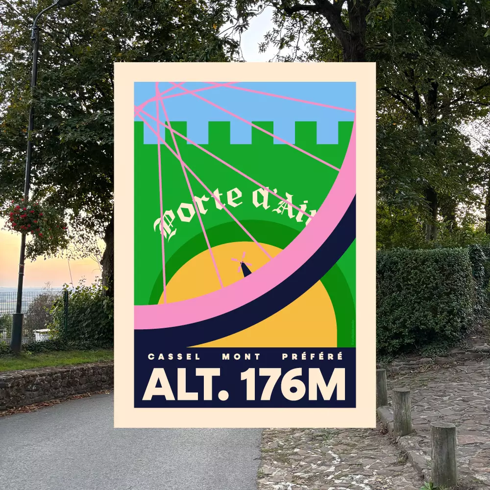 Affiche verte. Le mont Cassel fait partie des trois monts préférés des cyclistes. Première et quatrième étapes du Tour de France, le mont Cassel représente un défi pour tous ceux qui aiment se challenger.